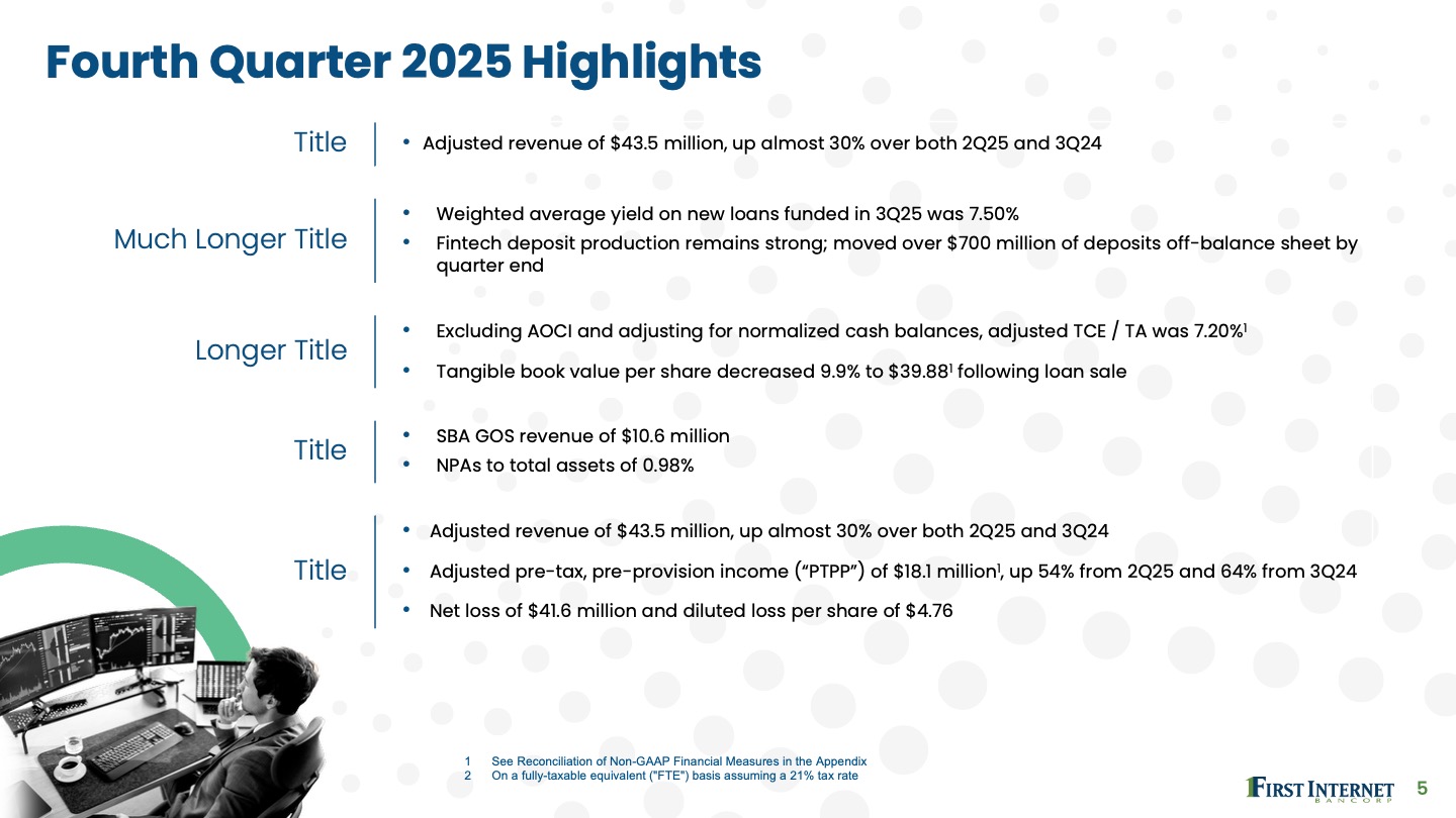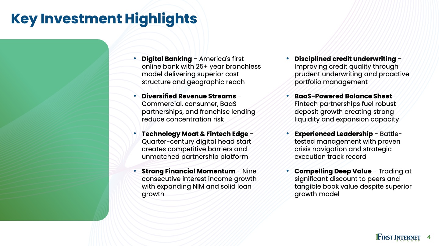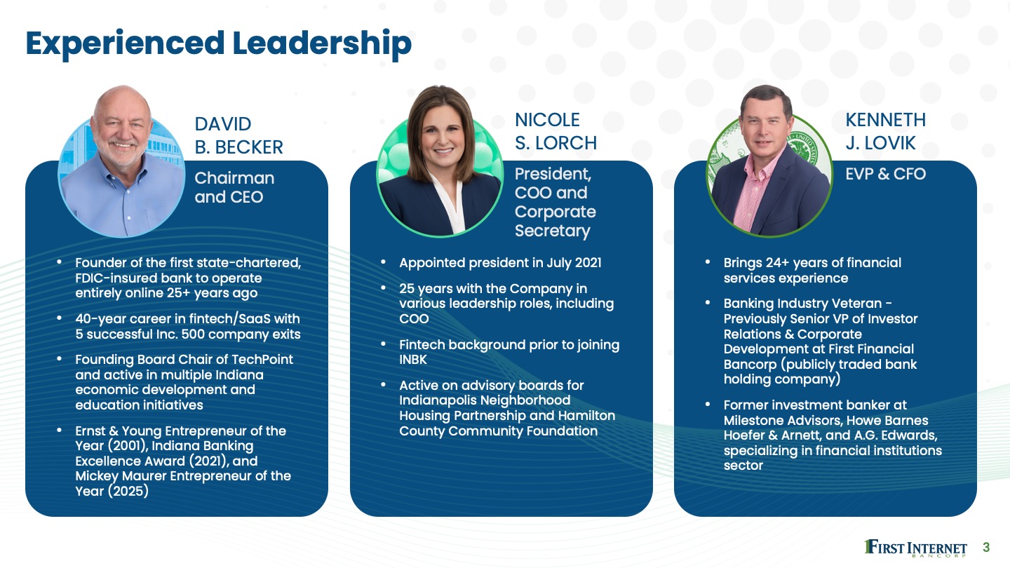 First Internet Bank reimagined the traditional banking model more than 25 years ago as the first state-chartered, FDIC-insured institution to operate entirely online. First Internet Bank partnered with Black & White to redesign its investor deck to provide a clearer, more streamlined, and informative message reflective of the entrepreneurial brand.